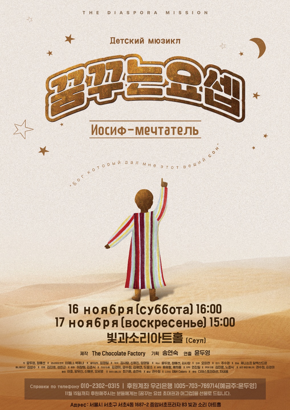 Для совместного будущего на территории Южной Кореи, взяв ответственность за следующее поколение этнических корейцев для того, чтобы избежать получения травм со стороны общества в новой обстановке, мы приготовили для вас этот мюзикл в надежде, что через него для многих откроются прекрасные двери в будущее, мечтая о Божьих делах, подобно Иосифу, победившему все жизненные страдания.